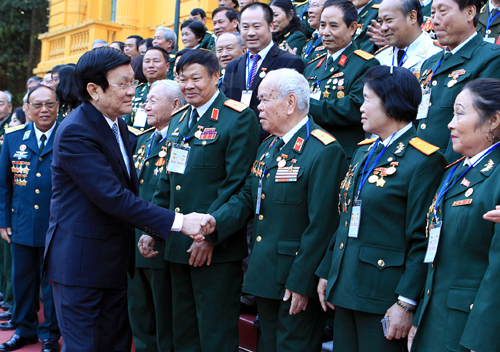 Chủ tịch nước Trương Tấn Sang với các cựu chiến binh đặc công. Ảnh: Nguyễn khang/TTXVN |