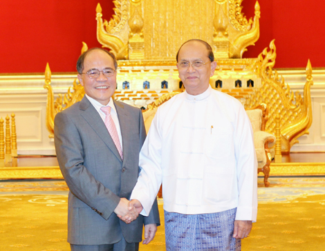 Chủ tịch Quốc hội Nguyễn Sinh Hùng chào xã giao Tổng thống Myanmar U Thein Sein. Ảnh: Nhan Sáng/TTXVN |