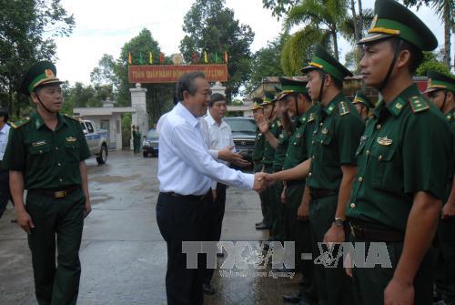 Phó Thủ tướng Thường trực Chính phủ Trương Hòa Bình đến thăm và làm việc với cán bộ chiến sỹ Đồn biên phòng Mỹ Thạnh Tây, Bộ chỉ huy biên phòng tỉnh Long An. Ảnh: Trần Hữu Hiếu/TTXVN |