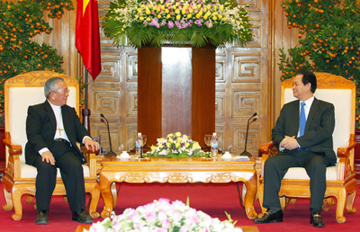 Chiều 21/1, tại Trụ sở Chính phủ, Thủ tướng Nguyễn Tấn Dũng đã tiếp Đoàn Hội đồng Giám mục Việt Nam do Tổng Giám mục phó Bùi Văn Đọc, Chủ tịch Hội đồng Giám mục Việt Nam dẫn đầu.Ngày 21/1/2014, tại trụ sở Chính phủ, Thủ tướng Nguyễn Tấn Dũng tiếp Đoàn Hội đồng Giám mục Việt Nam do Chủ tịch Phaolô Bùi Văn Đọc dẫn đầu. Ảnh: Dương Giang-TTXVN |