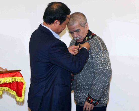 Phó Tổng giám đốc TTXVN Lê Duy Truyền (trái) trao Kỷ niệm chương "Vì sự nghiệp Thông tấn" cho ông Mai Thế Nguyên. Ảnh: Quý Trung