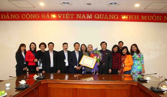 Ông Mai Thế Nguyên chụp ảnh chung cùng lãnh đạo, phóng viên, biên tập viên TTXVN. Ảnh: Quý Trung.