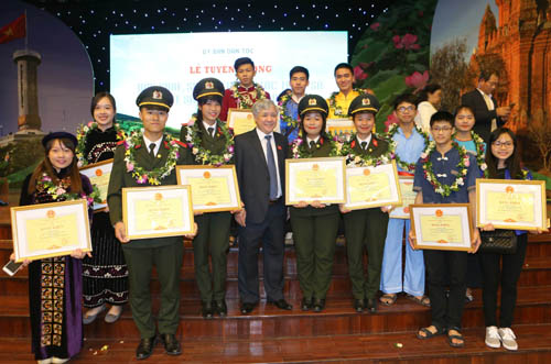 Bộ trưởng, Chủ nhiệm Ủy ban Dân tộc Đỗ Văn Chiến trao bằng khen cho các học sinh, sinh viên. |