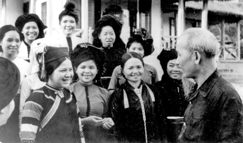 Hồ Chủ tịch gặp gỡ cán bộ nữ các dân tộc đang học tại Trường Cán bộ miền núi tỉnh Tuyên Quang ngày 20/3/1961. Ảnh: Tư liệu-TTXVN |