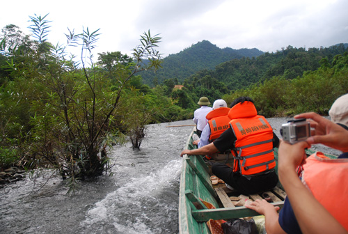 Du khách ngược sông Giăng vào vùng lõi của Vườn Quốc gia Pù Mát. |