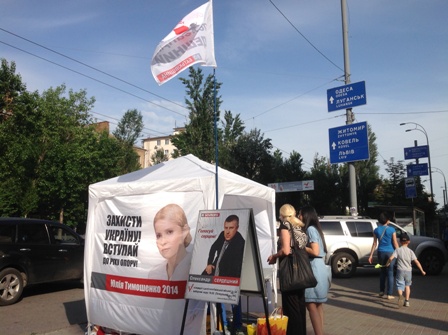 Tác giả tại một quầy vận động tranh cử của Đảng Tổ quốc tại Kiev, Ukraine. Ảnh: Quốc Thắng |