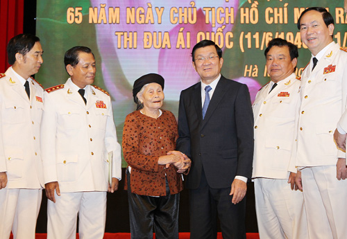 Chủ tịch nước Trương Tấn Sang với Mẹ Việt Nam Anh hùng và các đồng chí lãnh đạo Bộ Công an qua các thời kỳ. Ảnh: Nguyễn Khang - TTXVN |