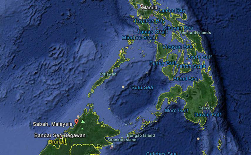 Malaysia đã ban bố tình trạng báo động đỏ ở bang miền đông Sabah sau khi thủ lĩnh Isnilon Hapilon của nhóm khủng bố Abu Sayyaf tuyên bố ủng hộ nhóm Nhà nước Hồi giáo (IS) tự xưng. Bản đồ khu vực. Ảnh: Google Earth |