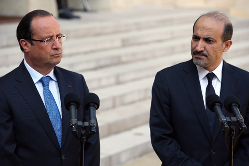 Tổng thống Pháp Hollande (trái) và lãnh đạo Liên minh Dân tộc đối lập Syria Ahmed Al-Jarba tại Paris ngày 29/8. Ảnh: AFP/TTXVN |