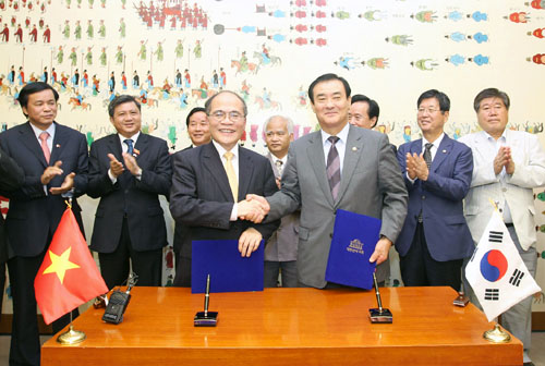 Chủ tịch Quốc hội Nguyễn Sinh Hùng và Chủ tịch Quốc hội Hàn Quốc Kang Chang-hee ký Thỏa thuận hợp tác giữa Quốc hội hai nước. Nhan Sáng-TTXVN |