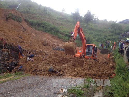 Lực lượng chức năng nỗ lực tìm kiếm nạn nhân thứ 3 trong vụ sạt lở núi chôn vùi một nhà dân ở huyện Thông Nông. Cao Bằng. Ảnh: Quân Trang - TTXVN |