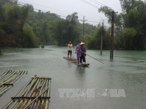 Một tuyến đường dài 2km ở huyện Thông Nông, Cao Bằng bị ngập sâu 2m, người dân di chuyển bằng bè mảng. Ảnh: Quân Trang - TTXVN |