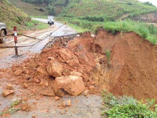 Tuyến đường liên huyện Thông Nông- Bảo Lạc, tỉnh Cao Bằng bị sạt lở. Ảnh: Quân Trang - TTXVN |
