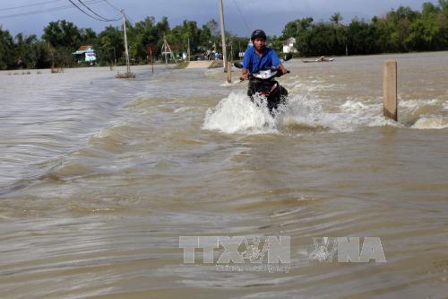 Nhiều người dân vẫn cố vượt qua các đoạn đường bị ngập lũ nước đang chảy xiết. Ảnh: Trần Lê Lâm/TTXVN. |