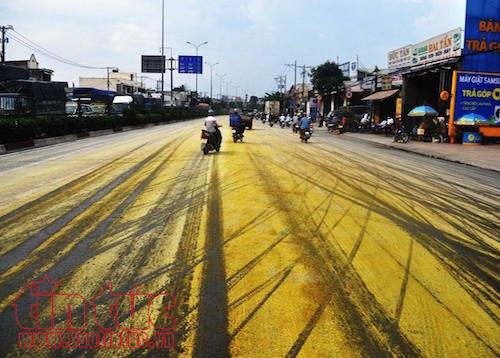 Hoá chất màu vàng đổ đầy đường. |