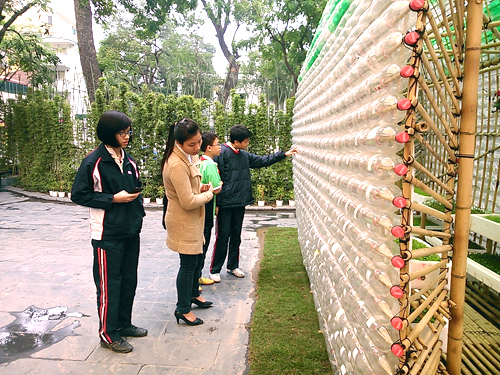 Khách tham quan ngôi nhà ươm rau được làm từ chai nhựa tái chế.  |