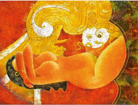 Giờ thì bạn họa sĩ của tôi đang đứng giữa những đứa con tinh thần mới tinh khôi lộng lẫy của mình. Được ngắm seri tranh hoàn chỉnh mới thấy ý đồ của của tác giả. Khởi nguyên - sự bắt đầu của thẩm mỹ nhân loại hẳn được gợi lên từ hình thể người đàn bà. Tranh anh có cái “Âu yếm phồn thực, nhục cảm một cách kín đáo”(chữ của nhà văn Dương Tường). Với tôi, nó là vẻ đẹp mạnh mẽ thủa hồng hoang của người phụ nữ gắn liền với chức năng sinh sản được cường điệu một cách chừng mực, dân dã. Xung quanh nhân vật chính còn thấp thoáng các loài thủy tộc: cá, rắn, mực ống… như ẩn dụ cho môi trường nước là tiên khởi của sự sống.