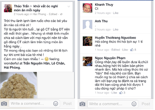 Thật ra, việc tham gia group nấu ăn ban đầu hoàn toàn là tích cực và đều vì mục đích “nữ công gia chánh”; nhằm giúp các thành viên có thể học cách nấu ăn của nhau, chia sẻ với nhau những món ăn ngon, lạ, độc đáo, những bí quyết để làm món ăn hấp dẫn hơn… nhờ đó đảm bảo cho bữa cơm gia đình nhà mình. Thế nhưng, từ mục đích tích cực này, nhiều “biến tướng” đã xảy ra, dẫn tới những chuyện thiếu văn hóa cộng đồng mạng. Như trên group “Khỏi vắt óc…”, một group uy tín bậc nhất hiện nay, mà trẻ, già, gái, trai đều thích tham gia vì có thể học được các món ăn, các công thức mới, có thể động viên nhau cùng ngâm chanh đào tháng 9, giấm bụp tháng 10, cùng làm chung món dồi lòng non thơm phưng phức chỉ cần up ảnh lên là thấy mê ly chan chứa. Những tưởng, ở nơi chỉ có ăn và vui, chỉ có khen và hào hứng; nhưng cũng ối chuyện dở khóc, dở cười.