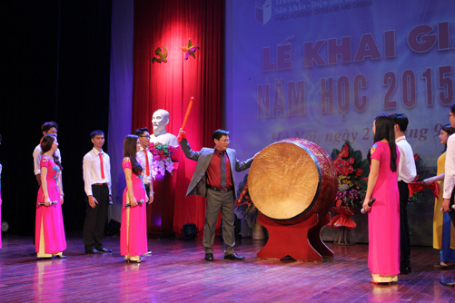 PGS.TS Nguyễn Đình Thi, Hiệu trưởng trường đánh trống khai giảng năm học mới 2015 - 2016. Ảnh: Trần Nhân Quyền |