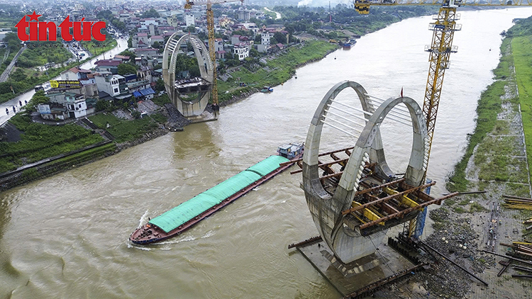 Cầu mới vượt sông Đuống có thiết kế độc đáo dần thành hình