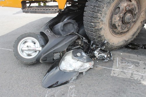 Một xe gắn máy của người đi đường bị xe cẩu cán bẹp. Ảnh: thanhnien.com.vn |