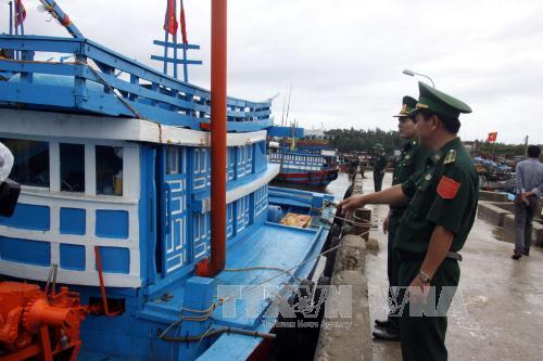 Lực lượng bộ đội biên phòng Quảng Ngãi kiểm tra tàu thuyền vào bờ tránh trú bão an toàn . Ảnh: Sỹ Thắng/TTXVN |