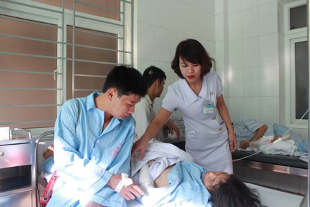 Y bác sỹ Bệnh viện 115 (Nghệ An) đang cấp cứu các nạn nhân trong vụ tai nạn. Ảnh: Tá Chuyên - TTXVN. |