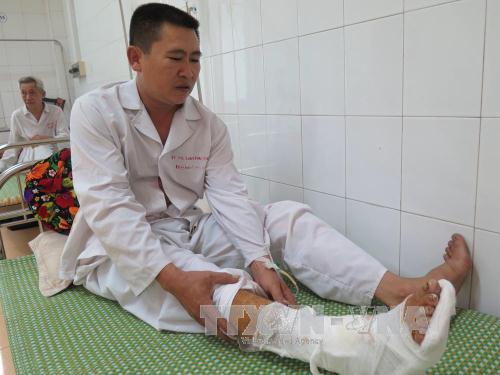 Anh Vũ Đình Tương, một trong những nạn nhân đang được điều trị tại Bệnh viện đa khoa tỉnh Hải Dương. Ảnh: Mạnh Minh-TTXVN