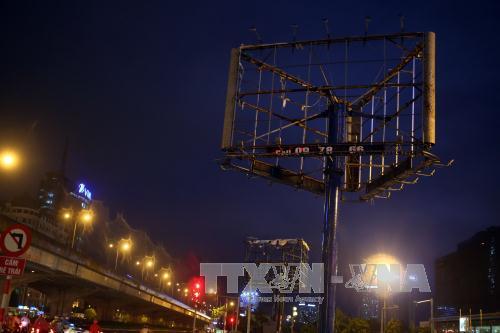 Hàng loạt biển quảng cáo trên đường Phạm Hùng bị bão quật đổ. Ảnh: Huy Hùng – TTXVN |