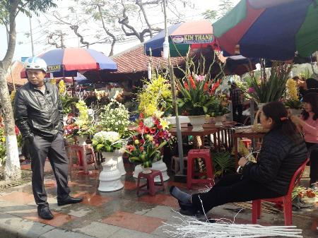 Và sáng 30 không lên Quán Hoa (gần Nhà hát Lớn Hải Phòng) thì thật phí. Vì đó là nói nhiều màu sắc nhất của phố phường. Dân Hải Phòng có thú chơi hoa bình, nên ở đây hầu như là bình cắm sẵn, có bình tulip tím, có bình tulip vàng, có bình toàn hoa hồng, có bình lại toàn hồng môn một màu đỏ thắm… Chủ hàng hoa xem ra cũng chưa lo lắng lắm, nhưng cũng có chút bồn chồn, vì hôm nay là ngày 30, “thời điểm quyết định” là vụ hoa thua hay thắng, nên đã ra tận sát vỉa hè để mời chào. Giá một bình hoa là 300.000- 400.000 đồng, đẹp và tươi, nhiều người cũng đã chọn mua, như một “điểm nhấn” cho căn phòng khách.
