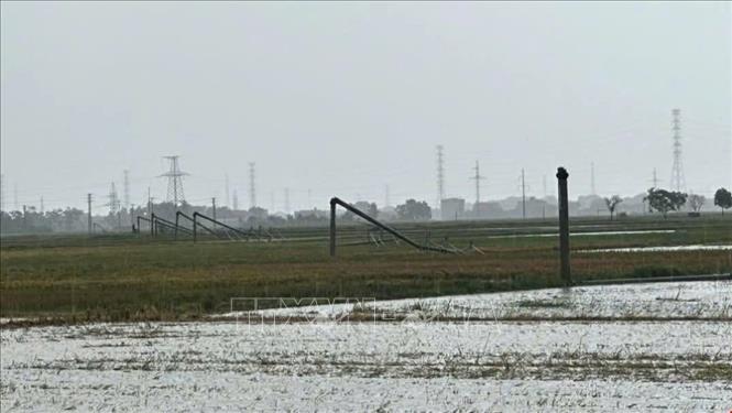 Có khoảng 15 cột điện bị gãy đổ, trong đó đa phần các cột điện bị gãy ngang ở vị trí khớp nối. Ảnh: TTXVN phát