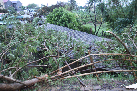 Theo Trung tâm dự báo khí tượng thủy văn Quốc gia, hồi 19 giờ hôm nay, vị trí tâm bão ở trên khu vực biên giới các tỉnh Hà Tĩnh – Quảng Bình và nước Lào. Sức gió mạnh nhất ở vùng gần tâm bão mạnh cấp 9, cấp 10, giật cấp 11, cấp 12. Cây xanh gãy đổ làm hư hại nhà dân ở thành phố Đông Hà, Quảng Trị. Ảnh: Hồ Cầu-TTXVN |