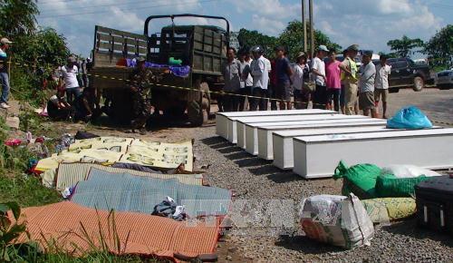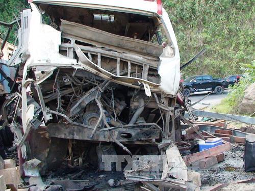 Hiện trường vụ nổ và cháy xe khách Việt trên đất Lào. Ảnh; Mạnh Thành - Hoài Nam/TTXVN